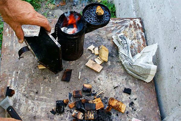 - Po úplném zapálení přidejte malé množství paliva. Když vychází hustý kouř, bunkr je naplněn palivem nahoru. Nasaďte tubu.