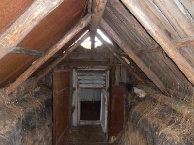 - Střecha musí být provedena se sklonem, aby se nehromadily srážky. Jako střešní materiál se používá břidlice, střešní krytina. Střecha je maximálně izolována přírodními materiály: sláma, rákos. Pokud se zimní dům nachází v blízkosti lesa, může být střecha pokryta smrkovými větvemi.