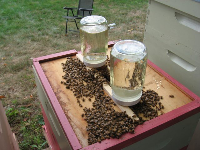 - Otevřená metoda krmení, kdy se tekutina nalije do malé nádoby a umístí se poblíž vchodu do úlu.