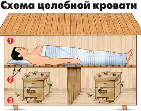 Terapeutický účinek během spánku nastává v důsledku mikrovibrací vytvořených včelami, stejně jako v důsledku skutečnosti, že vzduch kolem úlů je naplněn ionty, které ničí patogenní mikroby.