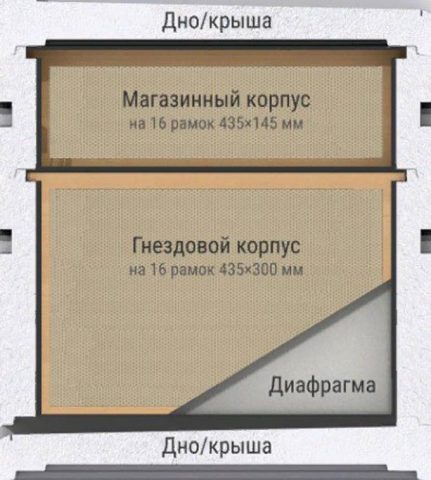 Pro profesionály jsou vhodnější výkresy úlu penoplex pro 16 rámů o rozměrech 435x300 mm. Dům má hnízdový oddíl (690x540x320 mm), obchod s polovičním rámem (690x540x165 mm). Víko a dno úlu PPS mají rozměry 690x540x80 mm. Velikost otvoru 450x325x25 mm. Modulární dům "Dobrynya +", vyrobený tuzemským výrobcem, má podobné parametry.