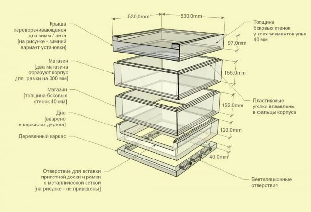 Nejjednodušší možností je vyrobit PPP úl se 6 rámečky pomocí pěnových fólií. Zkušení včelaři často používají k montáži expandovaný polystyren jádra a Dadanov. Na přání si můžete vyrobit solárium. Úl s více těly s 10 rámečky o rozměrech 450 x 375 mm je považován za rozšířený.