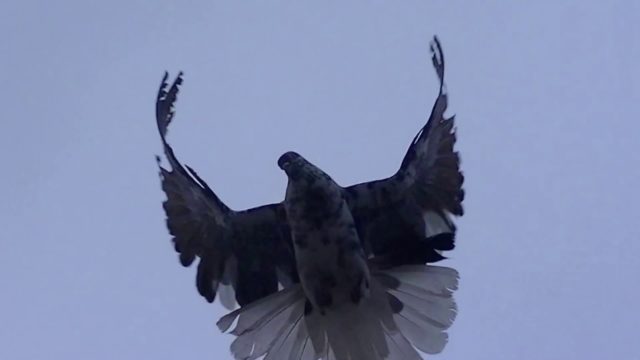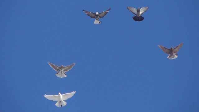 K dispozici je video o srpových holubech, které ukazuje, jak chovatelé trénují ptáky v chladném počasí a silném poryvu větru.