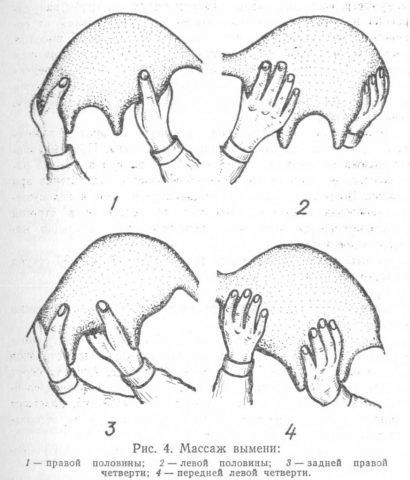 Před dojením se provede předběžná masáž, přičemž oběma rukama sevřete každý ze 4 laloků. Pak: