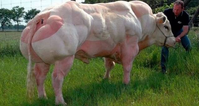 Toto nejlepší hovězí plemeno krav vzniklo náhodou. V genotypu obyčejného skotu byl v důsledku mutace „rozbit“ gen odpovědný za omezení růstu svalové hmoty. Nebylo použito žádné genetické inženýrství. Podobný jev existuje u psů.