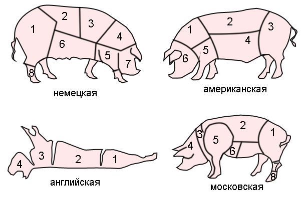 Ruské schéma řezání jatečně upravených těl zahrnuje 8 různých dílů.Tato metoda je populární v celém postsovětském prostoru. Po zpracování je spotřebitelům zasláno následující: