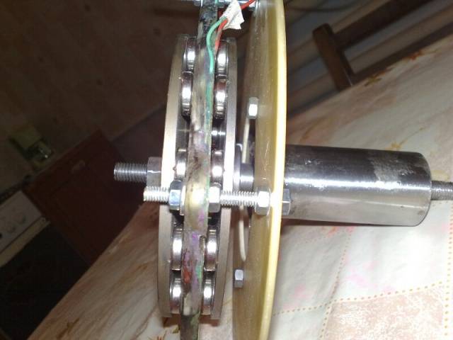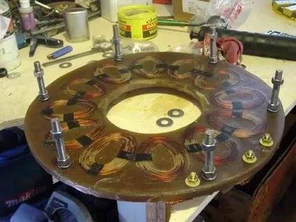 Dalším krokem je montáž rotoru. Zde budete potřebovat magnety. Nejprve jsou odebrány dva feritové disky o průměru 23 cm, k jednomu disku je pomocí lepidla připevněno šest neodymových magnetů. S průměrem magnetu 165 cm, úhel 60o... Pokud jsou tyto prvky menší, pak se jejich počet zvýší. Magnety nejsou lepeny jen náhodně, ale střídavě mění polaritu. Feritové magnety jsou připojeny k druhému disku podobným způsobem. Celá struktura je hojně nalita lepidlem.