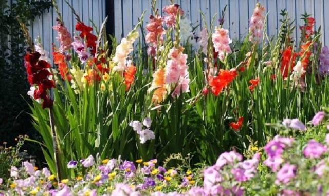 Jaké další rostliny se kombinují s gladioly při terénních úpravách? Z vysokých je třeba věnovat pozornost agerátům, zinnias, phloxes, asters, lavateria, dimorphoteku, poddimenzovaný tabák. Pokud se přesto rozhodnete zasadit trvalky, pak je dobré vzít si oregano, solidago, rue nebo šalvěj. Nezapomeňte na hostitele, poddimenzované daylilies jsou skvělou volbou pro výzdobu oblasti kolem altánu. Vše záleží na stylu projektu terénních úprav vašeho webu.