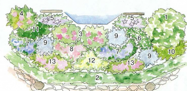 Mezeru mezi plamének a zimostrázem by měly zaplnit středně velké rostliny: hautma (13), echinacea (12), okrasná cibule (6), verbena (8), korejská máta (11). Vyplní kompozici lehkostí a odstínem zimostrázového pelyněk (10) s ozdobným stříbřitým listem.