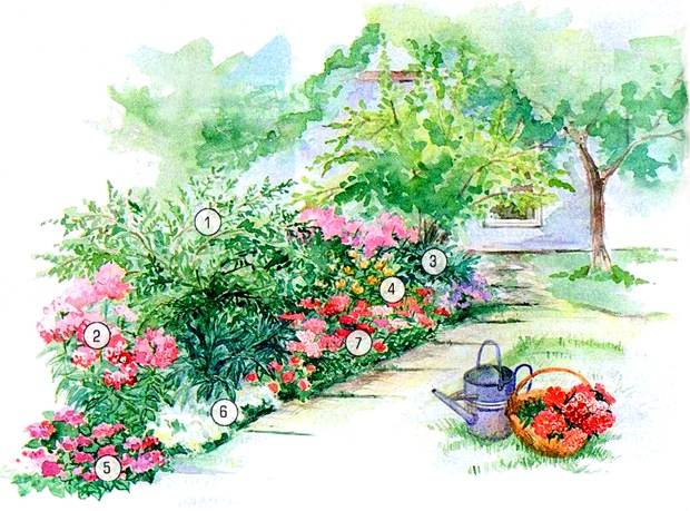 Dokonce takové hotové schéma může implementovat i začínající zahradník. Lze jej použít jednostranně i oboustranně. Kosterní rostlina květinové zahrady je vysoká falešně oranžová (1). Vpravo a vlevo od něj je nutné uspořádat pivoňky (2) a floxy (3). Lilie (4) a mexické ageratum (5) lze použít k vytvoření další vrstvy středně velkých rostlin. Mezi zakrnělé trvalky se pro vytvoření kompozice doporučuje zvolit mořské lobularie (7), turecký karafiát (8).