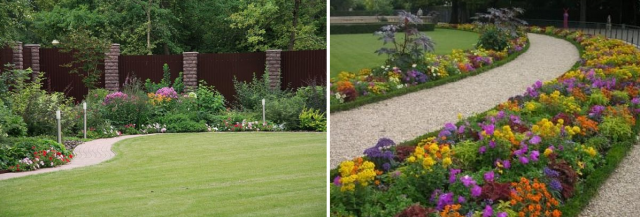 - Mixborders mohou být jednostranné nebo oboustranné... Jednostranné květinové záhony jsou umístěny podél chodníků nebo cest, za nimi může být zeď budovy nebo plot. Oboustranná květinová zahrada předpokládá přítomnost cest nebo hledisek z obou stran. Příklad jednostranného a oboustranného mixborderu je uveden na fotografii: