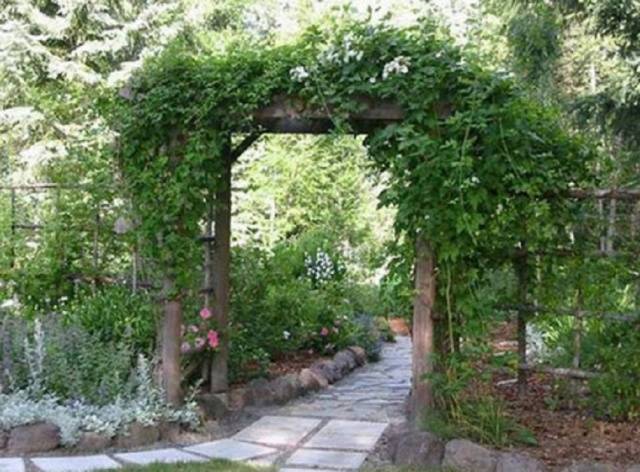 Pergoly s popínavými rostlinami, umístěné na několika místech, pomohou snížit viditelnost pozemku o rozloze 6 akrů.