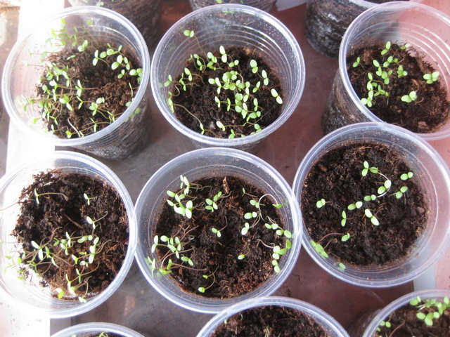 - Půda se nalije do hrnců, semena se položí a trochu rozdrtí, není nutné prohlubovat. Navlhčete rozprašovačem.
