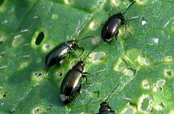 Křižácká blecha opouští malé díry v listech Allisum Snow Princesses