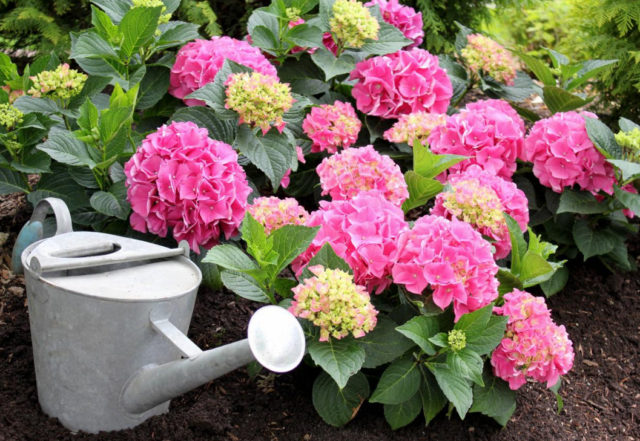 Nejlepší je použít k zalévání hortenzie dešťovou vodu. Instalatérství je špatná volba. Vhodný čas na zalévání je ráno nebo večer. Množství kapaliny na keř je 2 kbelíky.