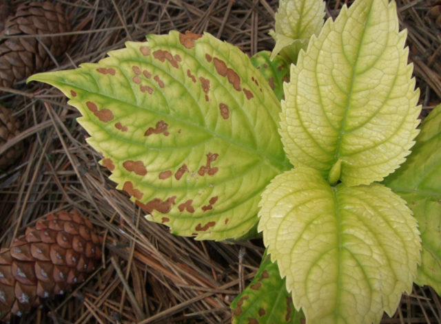 Nadměrný obsah humusu je považován za příčinu vývoje. Způsob, jak problém hortenzie odstranit, je zalévat jej roztokem síranu měďnatého (s přídavkem mýdla).