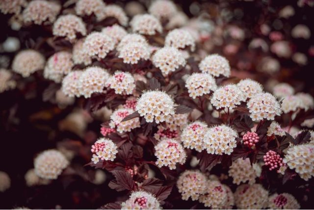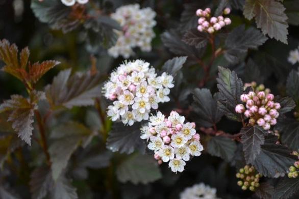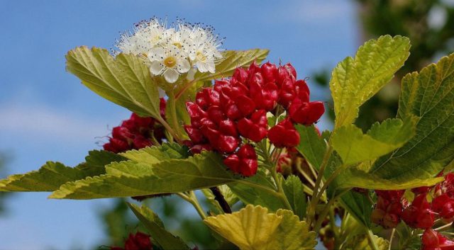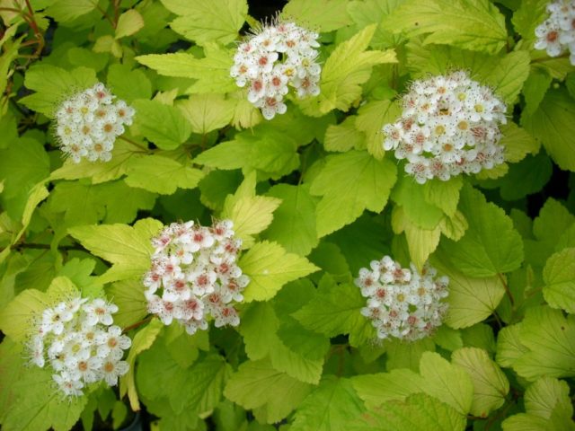 Odrůda Nugget, jejíž keře dosahují výšky až 2 m, přitahuje pozornost svými zlatavě světle zelenými listy. Na pozadí kompaktní koruny vypadají obzvláště působivě bílé květenství corymbose s růžovými tyčinkami. V teplých podmínkách kultura často potěší opakovaným kvetením, ke kterému dochází koncem července - začátkem srpna.