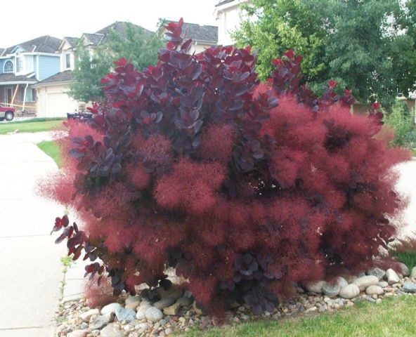 Tento keř okamžitě přitahuje pozornost nejen svými listy, ale také svým objemem koruny, protože s nízkou výškou 1,5 - 2 m má průměr 2,5 - 3 m.Modrofialové listy v povětrnostních podmínkách Moskevské oblasti si zachovávají svoji barvu po celé léto a červené se stávají až na podzim. Vzdušné květenství má lila-fialový odstín podobný listím.
