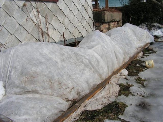 - Větve jsou ohnuté k zemi, předtím je svázané a pod ně umístěny smrkové větve. To je nezbytné, aby kůra nepřicházela do styku se zemí.