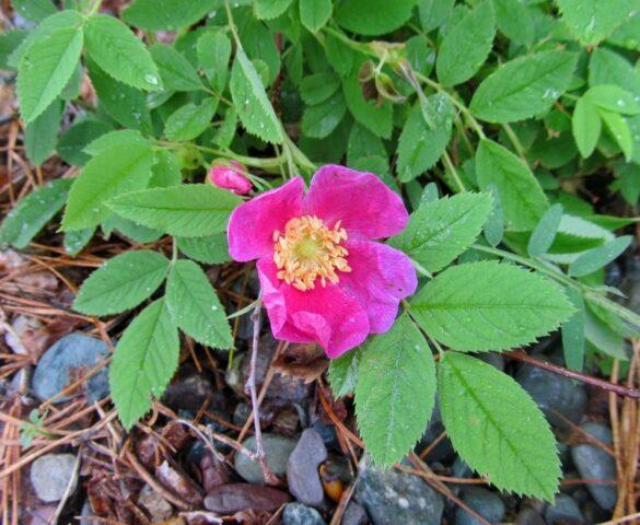 Středně velký keř kvete v červnu a červenci s krásnými tmavě růžovými pupeny s celými okraji. Listy jsou složené, zpeřené, na spodní části výhonků jsou dva zakřivené vyčnívající trny. Bobule rostliny jsou jasně červené, mají sférický tvar.