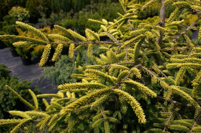 V počátečních fázích vývoje má smrk tendenci růst vzhůru, aniž by dával boční větve. Kmen je rovný, kulatého tvaru a se šedou kůrou, která se stratifikuje do malých tenkých desek. Jehly jsou tenké, umístěné na větvích ve spirálovém pořadí. Paleta možných barev zahrnuje zelenou, modrou, žlutou a šedou. Kužele jsou špičaté, mírně protáhlé, válcovitého tvaru. Jejich délka je až 15 cm a jejich průměr je nejméně 4 cm.
