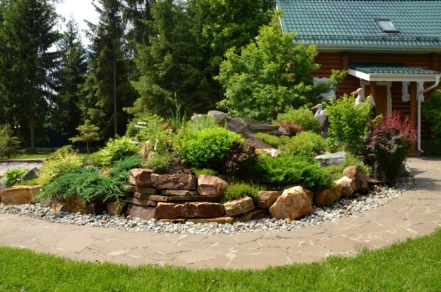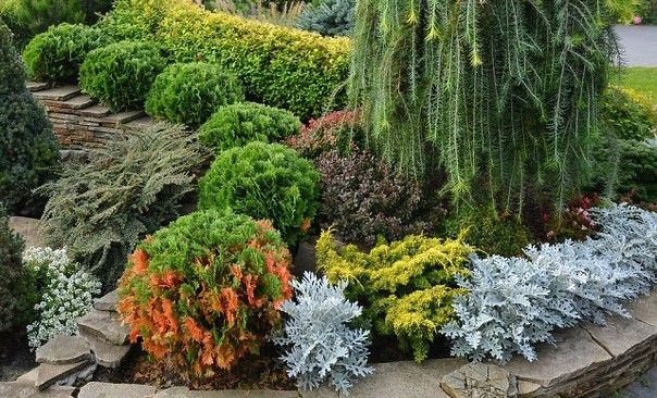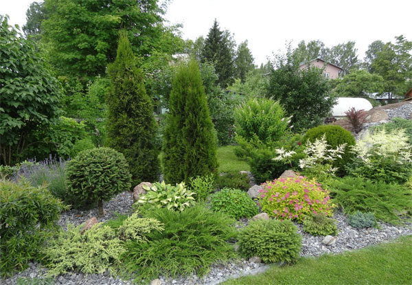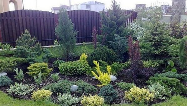 - Velký květinový záhon... V prvních řadách je vodorovný jalovec nebo jedlovec, dále - thuja a listnaté keře. Ve třetí řadě je několik vysokých jehličnanů: evropský modřín, bobulovitý tis a borovice.