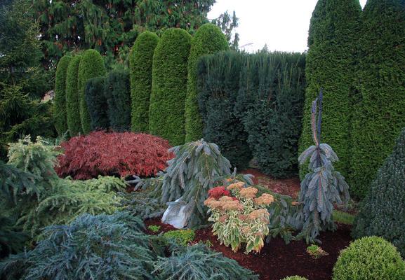Trpasličí jehličnany mají bohaté dekorativní vlastnosti a paletu barev jehel, což jim umožňuje používat k vytváření neobvyklých a barevných kompozic. Tento typ zahrnuje: