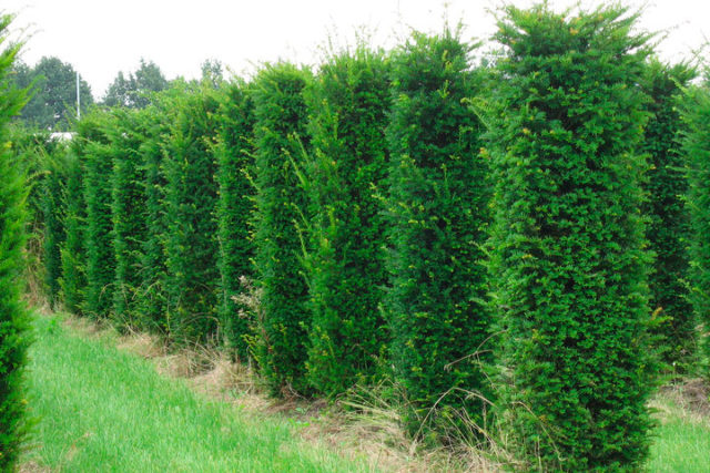 - Živé oplocení jehličnanů... K jeho vytvoření nejčastěji používají západní thuju, jalovec, tis nebo smrk. Chcete-li získat hustou a rovnoměrnou jehličnatou zeď, jsou mladé sazenice umístěny blízko sebe a také provádějí každoroční svírání ročního růstu a řezání koruny, aby získaly požadovaný tvar.