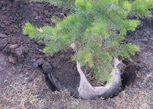 Sazenice je vykopána spolu s hliněnou hrudou. V tomto případě musíte sledovat, že průměr kómy není menší než rozpětí dolních větví. Pokud nebylo možné vykopat borovici s hrudkou nebo se během přepravy rozpadla, je nutné kořeny zabalit hadříkem a udržovat je vlhké. Před výsadbou ponořte kořeny do roztoku Kornevin.