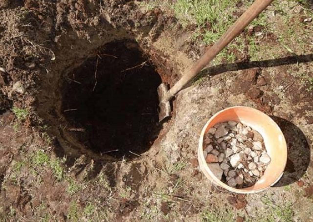 - Na dno výsadbové jámy položte drenážní vrstvu.