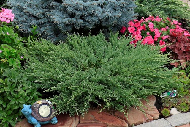 Juniper Virginia Hetz (na snímku) se používá jako popředí na záhonu v kompozici s trpasličími jehličnany a kvetoucími rostlinami. Aplikace hetz jalovce v designu: