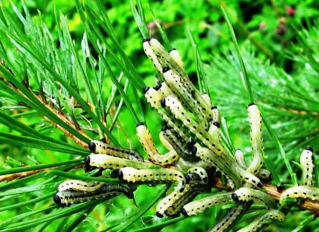 Horník můra | Škůdce motýla, jehož housenky zevnitř hlodají jehly. | Léčba přípravkem Decis dvakrát v intervalu 25 dní.Podzimní kopání kruhů v blízkosti kmene a ošetření půdy fungicidy. |