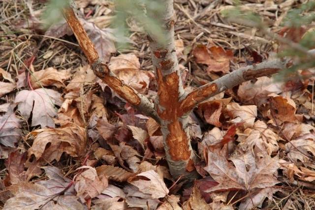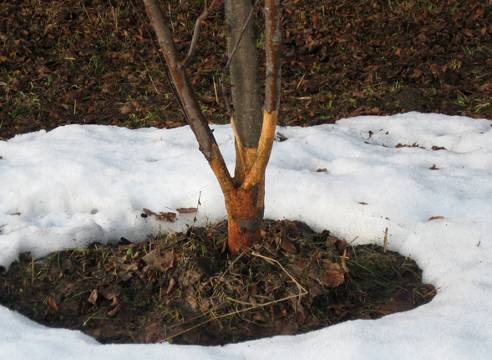 Pokud je na místě sníh, myši poškodí část kufru, která je pod sněhem. Zahradník si proto nemusí okamžitě všimnout, že kůra jabloní byla snědena myšmi, stopy přítomnosti hlodavců se obvykle nacházejí na jaře, kdy se sníh roztaje. Nejdůležitější v tomto případě není ztrácet čas a okamžitě začít reanimovat jabloň.