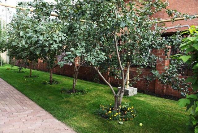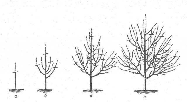 - Roční sazenice bez postranních větví by se na jaře měly zkrátit na 80 cm, na vodítku by mělo zůstat nejméně deset pupenů (bude to centrální výhonek nebo kmen stromu). V následujících letech z těchto očí vyrostou boční výhonky - patra stromu. Vznikající listy na stonku jsou odříznuty do výšky 40 cm od země.