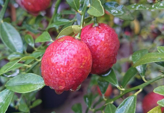 - Plody svým tvarem připomínají klasické citrony, jejich délka dosahuje 5 - 8 cm, šířka - 3 - 4 cm, jejich slupka je v době nástupu technické zralosti tenká, jasně oranžová, červená nebo třešňová. Buničina ovoce je umístěna v segmentech, které se tvarově liší od obvyklých citrusových plodů a při dozrávání získávají červený odstín. Hustá a šťavnatá, chutná sladce a kyselě.