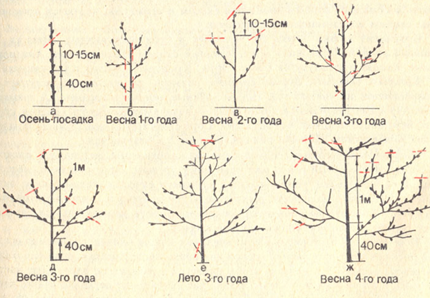 Prořezávání je nejdůležitější technikou broskvové péče. Plodení a dokonce úspěšné zimování sazenice závisí na tvorbě koruny a regulaci zátěže. Standardní techniky prořezávání broskví jakékoli odrůdy jsou uvedeny na fotografii.