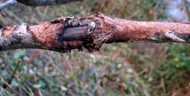 Toto onemocnění způsobuje poškození kosterních větví a stonku, obvykle na dospělých plodících hruškách. Nejprve se na kůře objeví malé praskliny, pak rostou a mění se v rány obklopené hnědými skvrnami. Listy a plody hrušky zčervenají, květy a výhonky zhnědnou. Pak vegetativní orgány vyschnou, ale nespadnou.