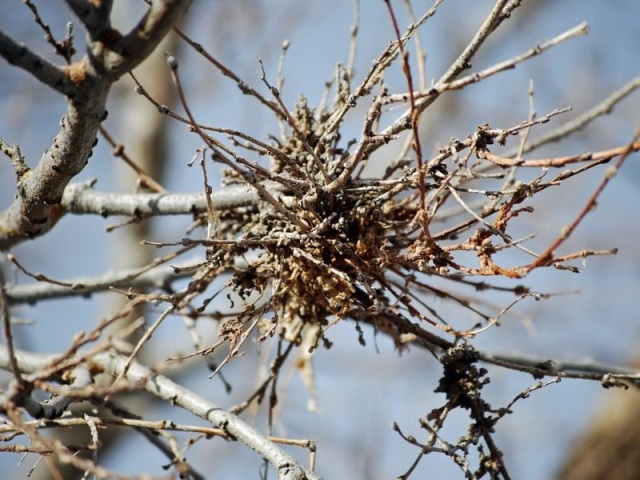 V místě proniknutí nemoci se probudí spící pupeny a mnoho tenkých výhonků roste s nerozvinutými, rychle se rozpadajícími listy. Zamotají se dohromady a vytvoří kulovou hvězdokupu, která opravdu vypadá jako jmelí.