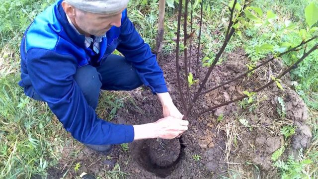 - Ve středu fossy je vytvořen kopec a v něm je upevněn silný dřevěný kolík, který bude sloužit jako podpora pro mladou třešničku.