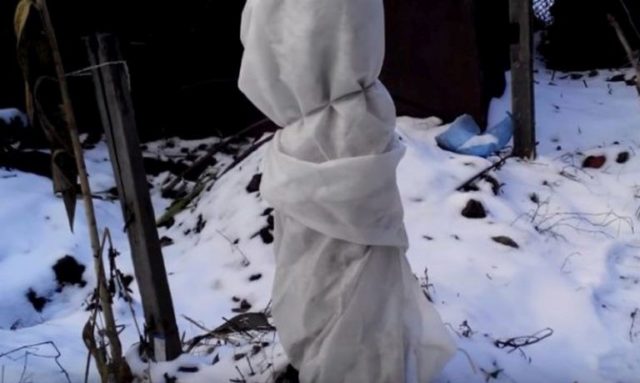 Kmen třešně je pokryt smrkovými větvemi. Kmen můžete také zabalit netkanou textilií nebo lehkou pytlovinou, což strom navíc ochrání před hlodavci.