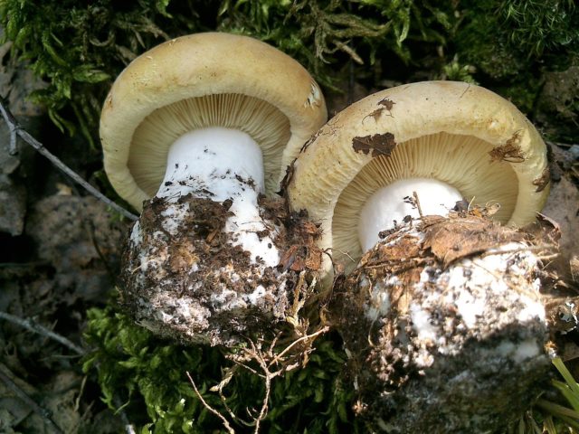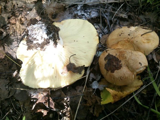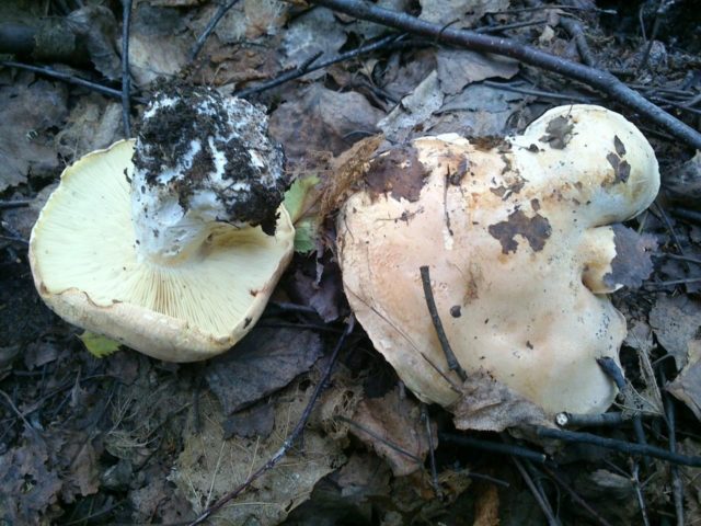 - Struktura je vodnatá, vatelínová, barva je monotónní, blíží se žluto-béžovému odstínu, okraje jsou tmavé. Desky jsou rovnoměrné, volné, široké - 1,5-2 cm, hustě uspořádané.