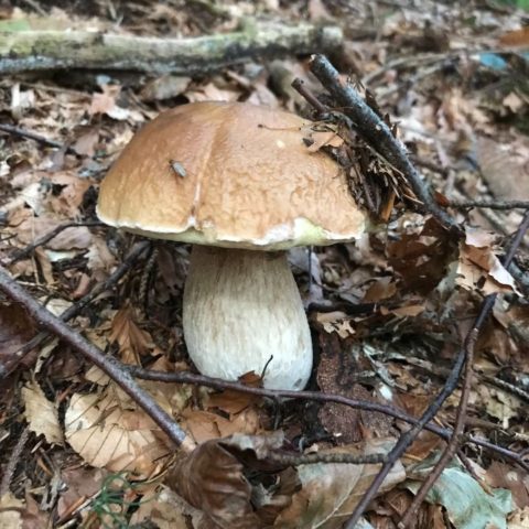 Houba stoupá 12 cm nad zem, noha dosahuje tloušťky 40 mm. Je hustá, tlustá, navenek podobná kyji nebo hlízě, má síťovaný vzor. Jak roste, stonek se stává válcovitějším, se zvrásněným povrchem, růžovo-béžovým a poté olivově bílým.