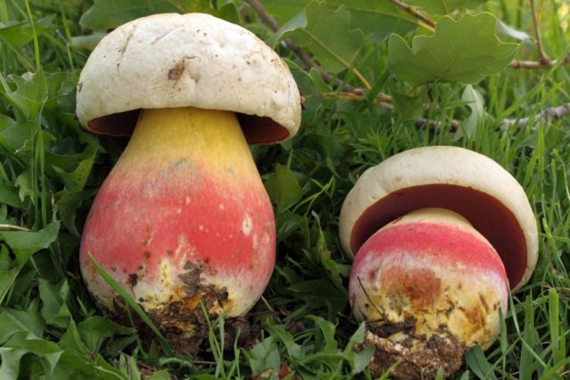 Důležité! Žlučníková houba téměř nikdy není červivá. - Satanské houby... To dostalo jeho jméno pro podobnost nohou v barvě s jazykem plamene unikajícím ze země. Charakteristickým znakem této houby je červená nebo oranžová stonka. Je to typické pro všechny Boletovy, klubovité, silné, husté. Čepice satanské houby je půlkruhová, s věkem se stává plošší, jako polštář. Jeho barva je olivově šedá, v různých odstínech. Vrstva spór je zelenožlutá. Buničina je hustá, nažloutlá, na přelomu obvykle zmodrá. Zvláštností satanské houby je její vůně. U mladých jedinců je to příjemné, kořeněné, ale s věkem začne dužina ovocného těla stále více páchnout po shnilé cibuli. Satanská houba roste od června do října, zejména v jižních oblastech evropské části Ruska, a vyskytuje se na území Primorsky. Ve své surové formě je druh jedovatý, ale v některých zemích se po dlouhodobém tepelném zpracování konzumuje. Tento falešný hřib je na fotografii níže: