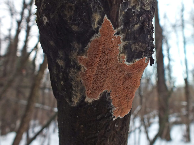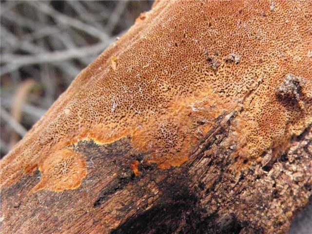 Plodnice je vyčerpaná, zbavená nohy a pevně spojená s podkladem. Pouze rezavě hnědé houbové houby, které se objevily, mají vzhled pubertálních načervenalých koulí, které rychle zabírají velkou plochu a spojují se do jednoho organismu. Okraje nemají vrstvu nesoucí spory, jsou sterilní, bílošedé nebo světle béžové, nažloutlé. Nerovnoměrná, nerovná, charakteristická plstěná konzistence. Barva je rezavě hnědá, cihlová, tmavá čokoláda, načervenalá, světle okrová, mrkev.