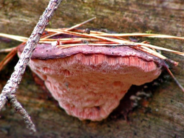 - Růžový troud houba - nepoživatelná houba neobvyklé barvy, usazuje se v jehličnatých lesích. Ovocná těla jsou vytrvalá, kopytovitá, méně často kachlová. V počáteční fázi vývoje je povrch víčka růžový nebo lila, s věkem se stává hnědý nebo černý. Charakteristickým rysem houby švadleny je růžový hymenophore.
