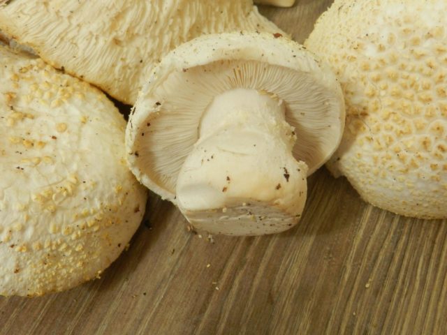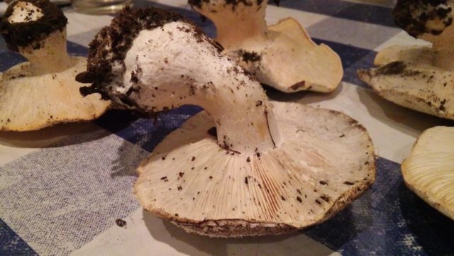 Zadní strana je pokryta tenkými bílými deskami umístěnými blízko sebe a klesajícími k pediklu. U starších hub získávají talíře citrónově krémovou barvu.