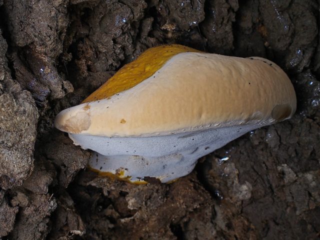 Klobouk tohoto exempláře je plochý, dřevitý nebo korkový. Dosahuje průměru asi 45 cm. Barva plodnice se mění s věkem. U mladých hub je tedy čepice červená se šedivými nebo okrovými okraji, poté postupně získává cihlový nebo hnědý odstín. Starší vzorky lze rozlišit podle černé barvy. V mladém věku je povrch lesklý, poté se otupí. Buničina je měkká, strukturou podobná korku, v mladém věku šedivá, v dospělosti červená nebo hnědá. Pod víčkem je hymenofor, jehož póry jsou kulaté, šedé nebo krémové barvy. Podlouhlé tubuly, jejichž velikost dosahuje asi 3 cm, jsou uspořádány v jedné vrstvě. Spory jsou hnědé, na vrcholu mírně zkrácené a pokryté dvouvrstvou membránou.