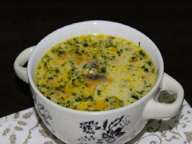 60 g proso krupice a jemně nakrájené cibule (1 hlava) se nalije do vroucí vody. Vařte až do poloviny vařených cereálií. Přidejte brambory (400 g), nakrájené na proužky a vařte, dokud nebudou uvařené. Před koncem vaření vložte kousky marinovaného bílého brouka (400 g), ochuťte rostlinným olejem (2 lžíce), osolte a vařte 10 minut.