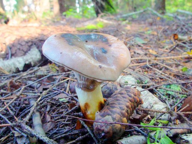 Noha s průměrem až 1,5 cm v bělavém odstínu, zatímco se zdá být oteklá, jak se rozšiřuje a rozjasňuje nahoru. Na základně je to hořčice, může mít tmavě šedé nebo černé skvrny, může být zakřivená. Hlen není exprimován, ale ze samotného víčka se vytvoří masivní prstenec. Noha dosahuje výšky 8 cm, má hustou strukturu.