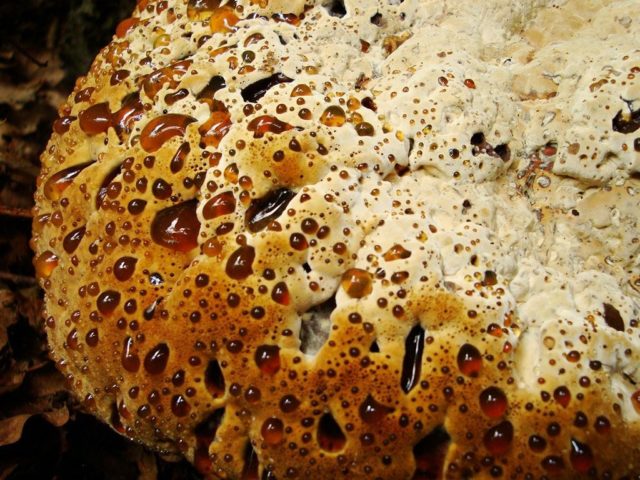 Při vysoké vzdušné vlhkosti je plodnice houby Tinder Tree pokryta žlutými malými kapkami kapaliny, podobnou pryskyřici nebo jantaru.